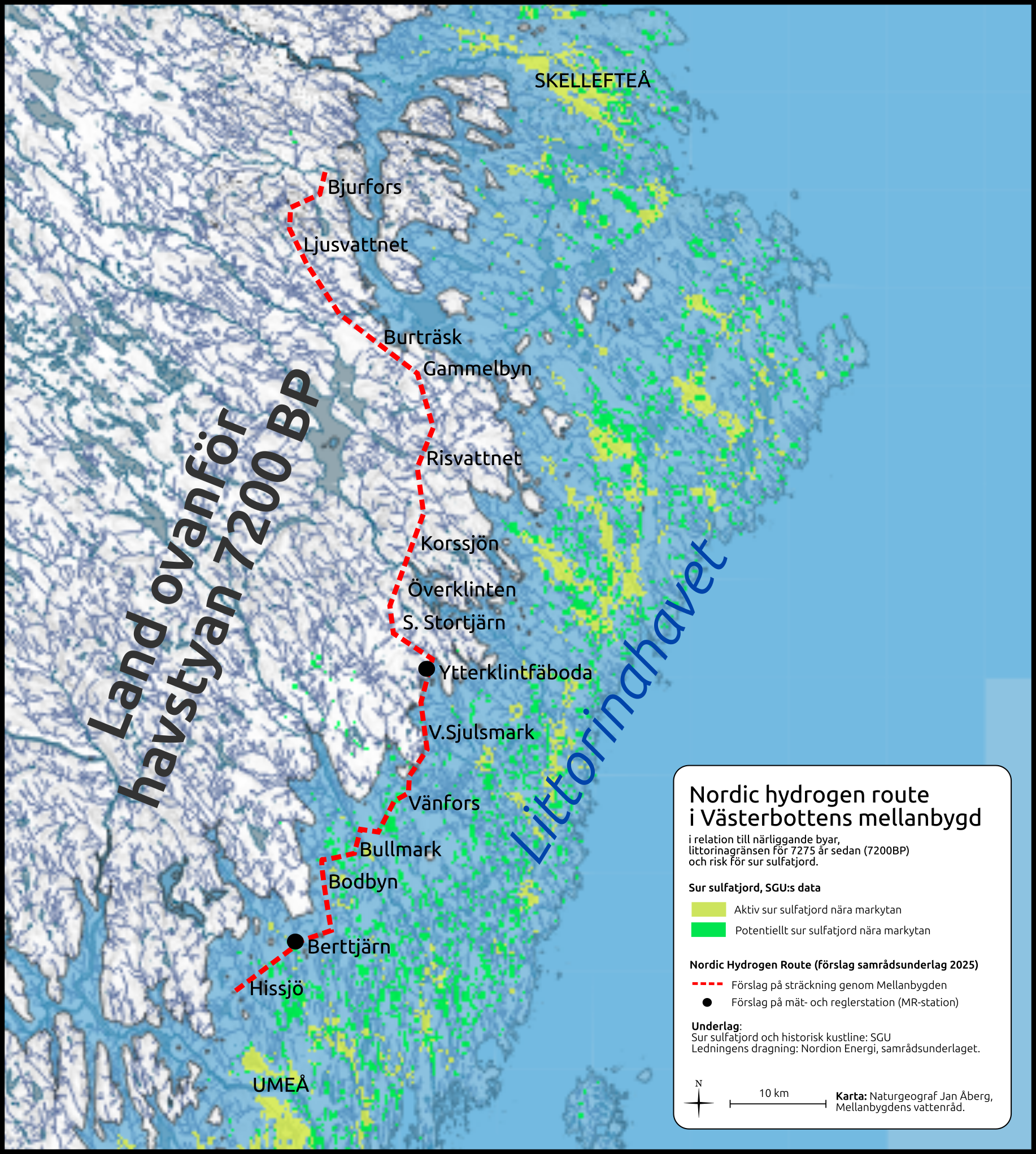 - Delar av sträckningen ligger på tidigare havsbottnar av Littorinahavet. Där kan det finnas sur sulfatjord, som ger samma typ av problem som sulfidmineralen i berggrunden. Områden vid små vattendrag, kallkällor, enskilda brunnar och samhällskritiska grundvattenförekomster är särskilt viktiga att skydda från påverkan från sur sulfatjord. Markavvattning från vägdiken eller upplag av massor är extra riskabelt i sådana områden. Den preliminära sträckningen går inte över Västerbottens kärnområde med sur sulfatjord, men det är viktigt att beakta att SGU:s kartor främst bygger på information om relativt ytliga jordprover. Vätgasledningen kan åtminstone bitvis komma att ligga på djup där jordens egenskaper inte är karterad.