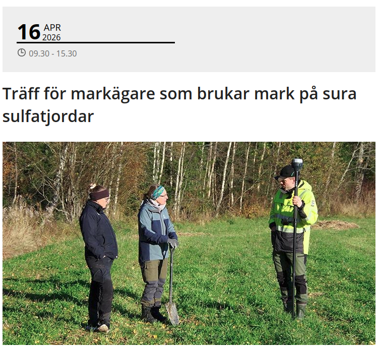 Läs mer och anmäl via Länsstyrelsens hemsida: https://www.lansstyrelsen.se/vasterbotten/om-oss/kalender/kalenderhandelser—vasterbotten/2026-04-16-traff-for-markagare-som-brukar-mark-pa-sura-sulfatjordar.html