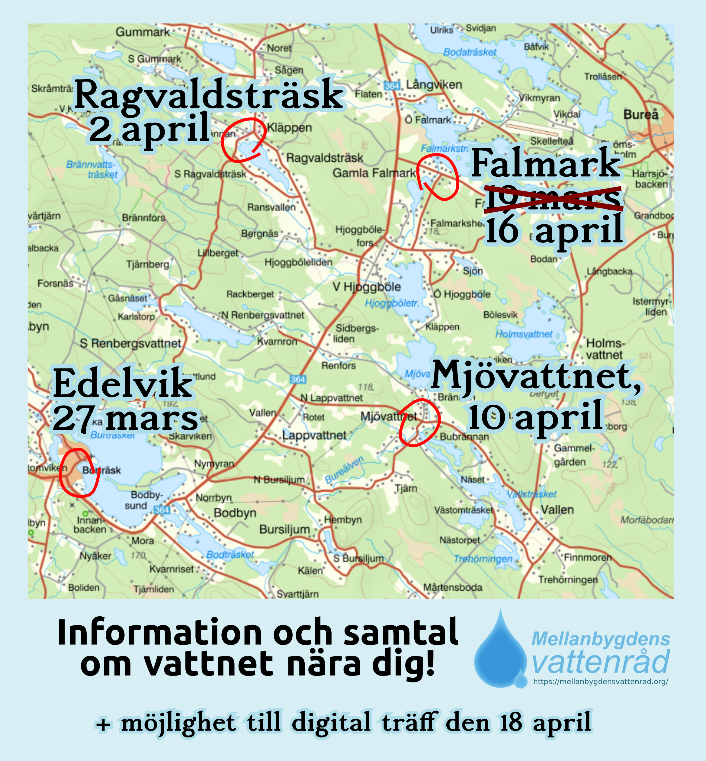 Välkommen till information och samtal om vattnet inom Bureälvens vittförgrenade vattensystem. Ingen föranmälan krävs, förutom till den digitala träffen 18/4.