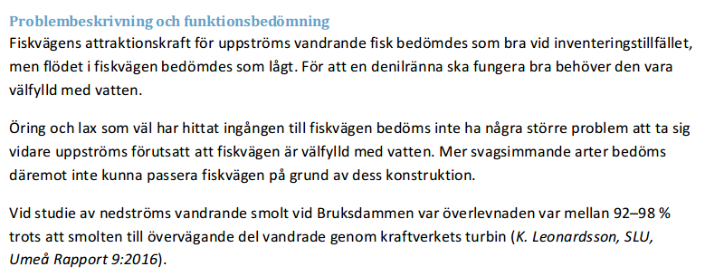 Här nedan ges beskrivningen av Bruksdammen (östra fiskvägen) som ett exempel från rapporten:
