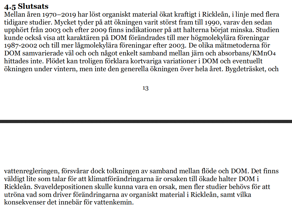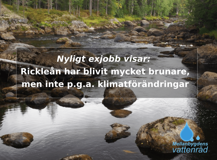 Den ökade färgen i Rickleån kan till stor del kan förklaras av att det finns mer organiskt material, men varför det finns mer organiskt material kunde inte fastställas, förutom att förändringar i klimatet troligen spelar en mycket liten roll. Läs hela exjobbet via denna länk.